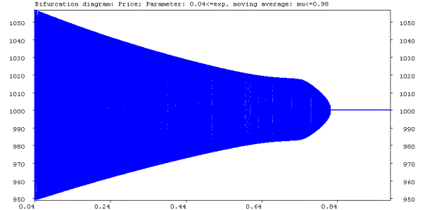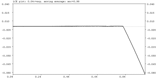 Figure 6.5: (a) Bifurcation diagram for the exponential moving average parameter µ with a Hopf bifurcation leading to quasi-periodic dynamics; (b) largest LCE plot.