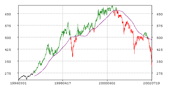 Figure 1.1: A 200-day moving-average trading rule applied to the AEX-index in the period March 1, 1996 through July 25, 2002.